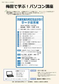 | 内容 | ワードを使ったことがある方向けのパソコン講座です。 毎日をもっと便利にする、一歩進んだパソコンの使い方にチャレンジしてみませんか? ワードの便利な機能を学び、さらに見栄えする文書・作品の作り方を学びます。 お知らせやいろんな作品を作りましょう。 講師・サポーターがわかりやすく、丁寧に指導します。 |