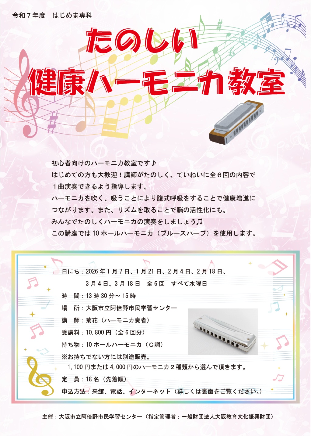 初心者向けのハーモニカ教室です。初めての方でも大丈夫。講師がたのしく、優しく指導します。