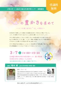| 内容 | 科学技術の発展により、仕事も人生相談も生成AIに任せる人が増えてきました。しかし、その便利さの中で、私たちの心は本当に豊かになっているでしょうか。 キリスト教の伝統は、心こそが人を変え、さらには世界を動かす力を持つと語ります。私たちの最も深いところに潜む「心」という神秘。 本講座では、キリスト教の思想をたどりながら、その豊かさと可能性を見つめ、味わいます。キリスト教徒である必要はなく、またキリスト教に関する予備知識も不要です。一般的な教養講座として、どなたでも安心してご参加いただけます。 ※この講座は、2026年3月7日(土)に実施する「心の豊かさを求めて―キリスト教における「心」の神秘―」を収録し、期間限定で録画配信するものです。 【ご受講の流れ】 1.受講申込み こちらのページよりお申し込みください。 ※ sougou-llc@manabi.city.osaka.jpからのメールを受信できるように設定してください。 2.受講用ページURLの送付 申込時に登録したメールアドレスへ受講用ページのURLとパスワードが送付されます。 3.受講用ページへアクセス メールに記載のURLから受講用ページへアクセスし、パスワードを入力してください。 4.資料ダウンロード 受講用ページから講座資料を必要に応じてダウンロードしてください。 5.動画視聴 受講用ページに記載の視聴URLをクリックし、パスワードを入力の上、動画を視聴してください。 6.アンケート 視聴終了後、受講アンケートへのご協力をお願いいたします。 ※お申込み後、受講案内のメールが届かない場合は、ご入力のメールアドレスが誤っているか、当センターからのメールが受信できない設定になっている可能性が考えられます。お使いのメールの受信設定をご確認いただき、センターまでお電話にてご連絡ください。 |