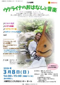 | 内容 | ウクライナの伝統楽器・バンドゥーラ。 いったいどんな音がするのでしょう? 日本で活動する数少ない奏者・カテリーナさんが、 美しい音色と歌声で、お子さまにも親しみやすい音楽をお届けします。 ウクライナのこと、少し知ってみませんか? ------------------------------------------------------------------- ~お座席と客席へのご入場について~ ・お申込は先着順に受け付け、事前にセンターがお座席を指定いたします。 席番は当日お伝えします。事前通知はいたしません。 ・当日は、受付で「受付完了通知」をご提示いただくか、申込者名をお伝えください。代金と引換にチケットをお渡しします。 |