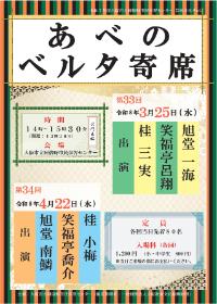 | 内容 | 毎月第4水曜日に開催のあべのベルタ寄席。 第33回3月の出演者は落語家の桂三実さん、笑福亭呂翔さん、講談師の旭堂一海さん。 第34回4月の出演者は講談師の旭堂南鱗さん、落語家の笑福亭喬介さん、桂小梅さんです。 |