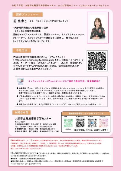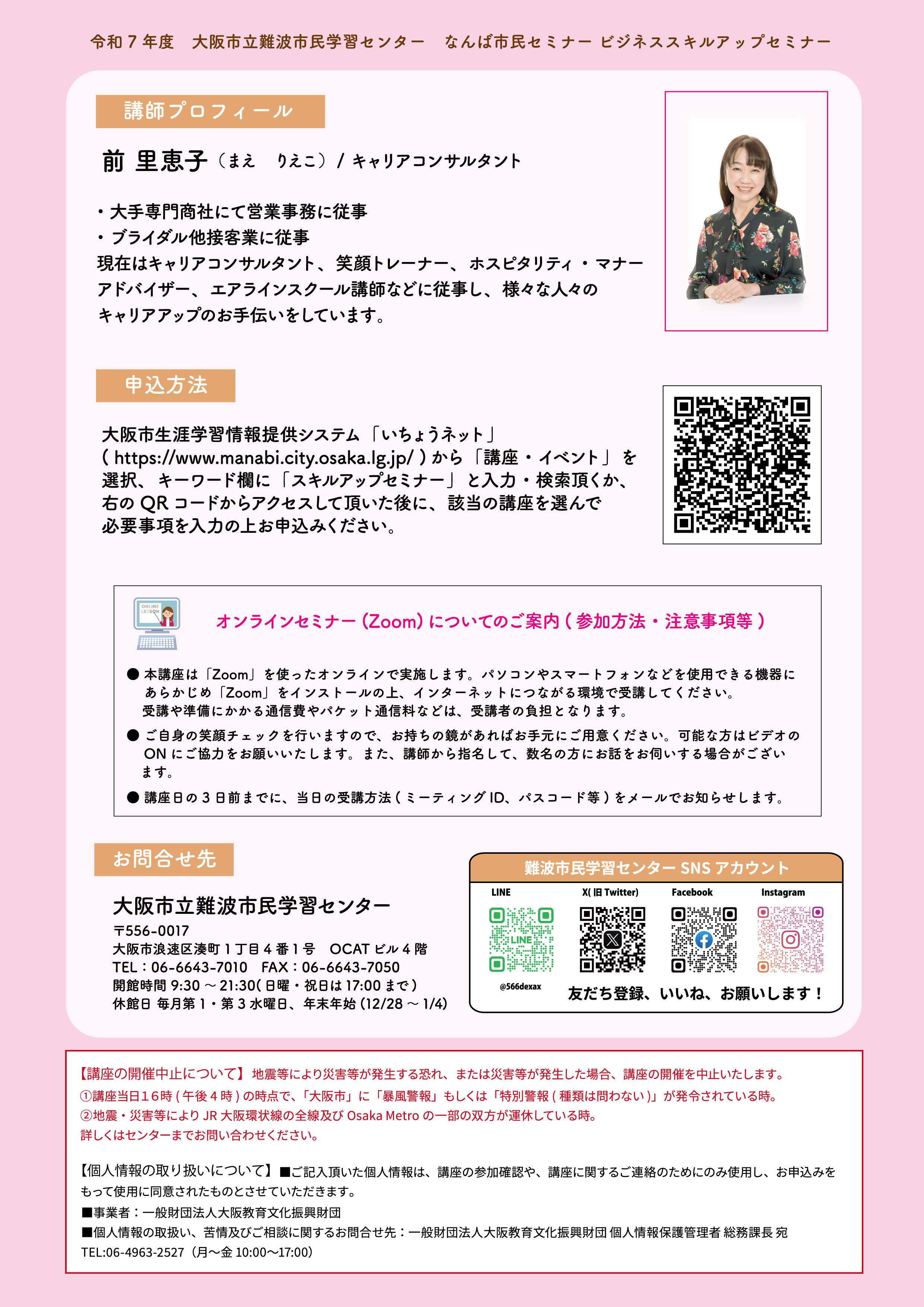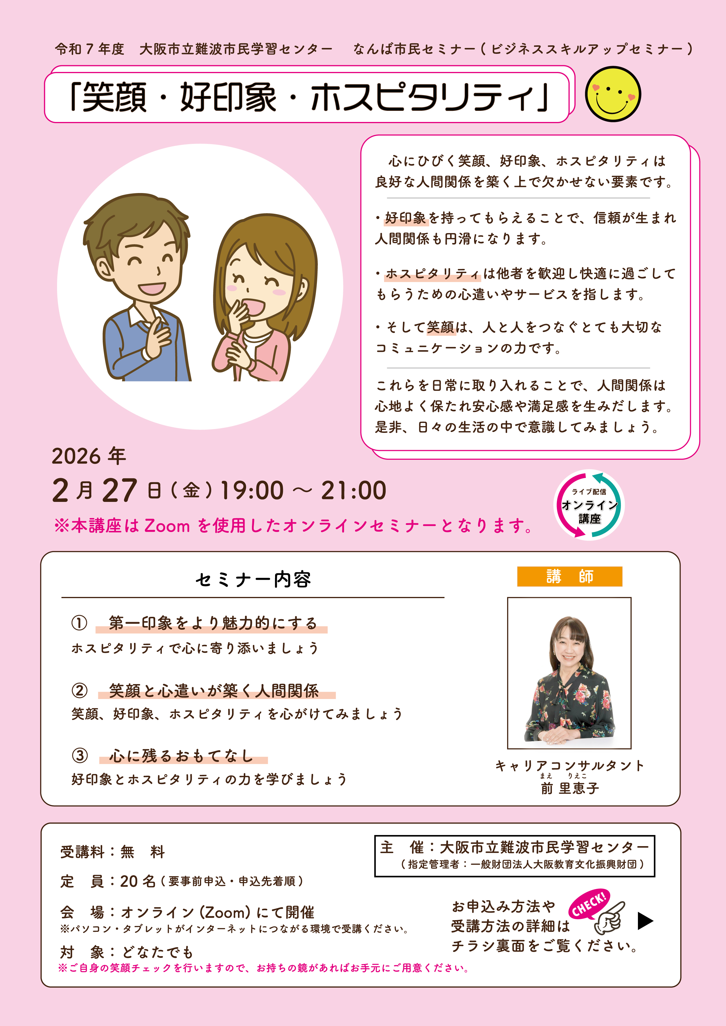 心にひびく笑顔、好印象とホスピタリティは良好な人間関係を築く上で欠かせない要素です。 このセミナーでは他者との関係性を良好に保つ方法や、安心感・満足感を提供するための重要な要素を学ぶことができます。 仕事・プライベートですぐに活かせるスキルアップセミナーです。 ※Zoomを使用したオンラインセミナーです。ご受講にはPC、タブレット、スマホ等Zoomを利用できる機器とインターネット環境が必要です。センターでは機器や回線の貸出などはございません。 |