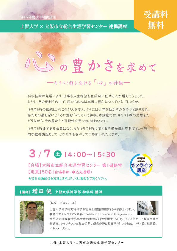 | タイトル | 【録画配信】〈上智大学×大阪市立総合生涯学習センター 連携講座〉心の豊かさを求めて―キリスト教における「心」の神秘― |