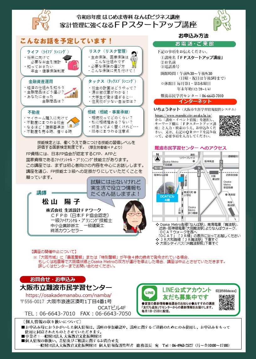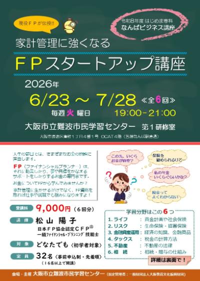 | タイトル | なんばビジネス講座「家計管理に強くなる FPスタートアップ講座」(6月クラス) |
