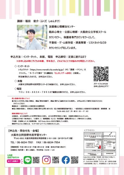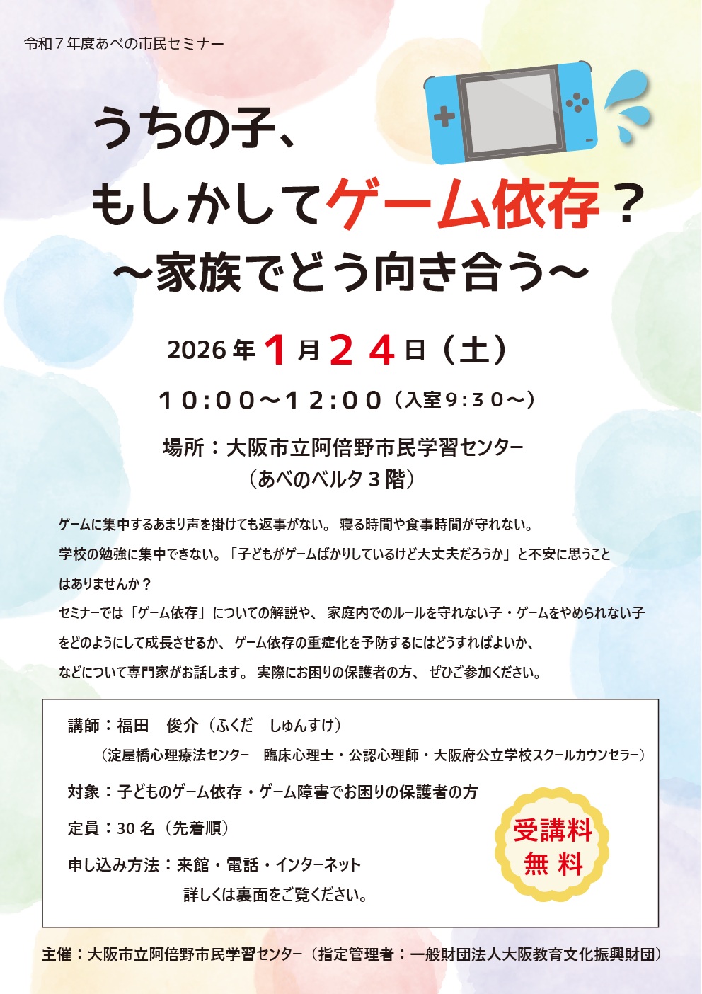 | タイトル | うちの子、もしかしてゲーム依存?~家族でどう向き合う~(あべの市民セミナー) |