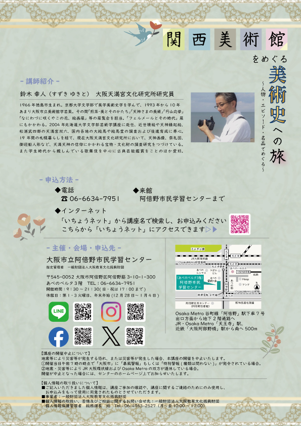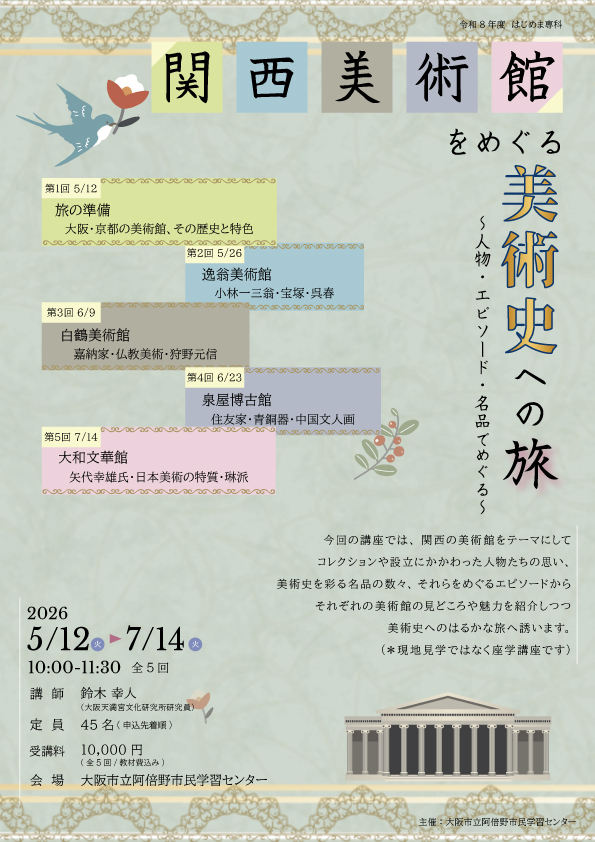 関西の美術館をテーマにして、コレクションや設立にかかわった人物たちの思い、 美術史を彩る名品の数々、それらをめぐるエピソードから美術館の見どころや魅力を紹介します。 (*現地見学ではなく座学講座です。) |