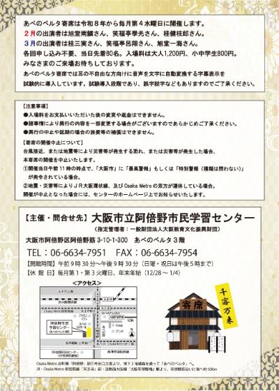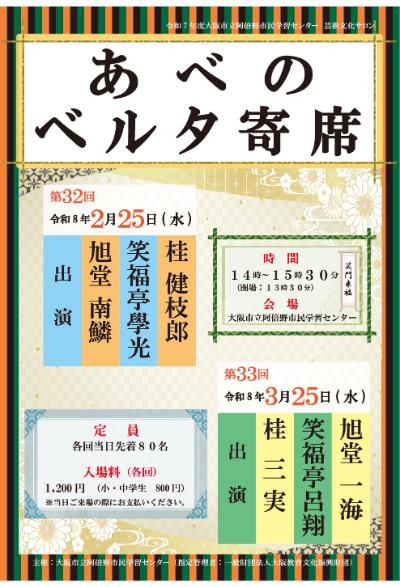 令和8年からは毎月寄席を開催することになりました。 第33回、3月の出演者は落語家の桂三実さん、笑福亭呂翔さん、講談師の旭堂一海さんです。 |