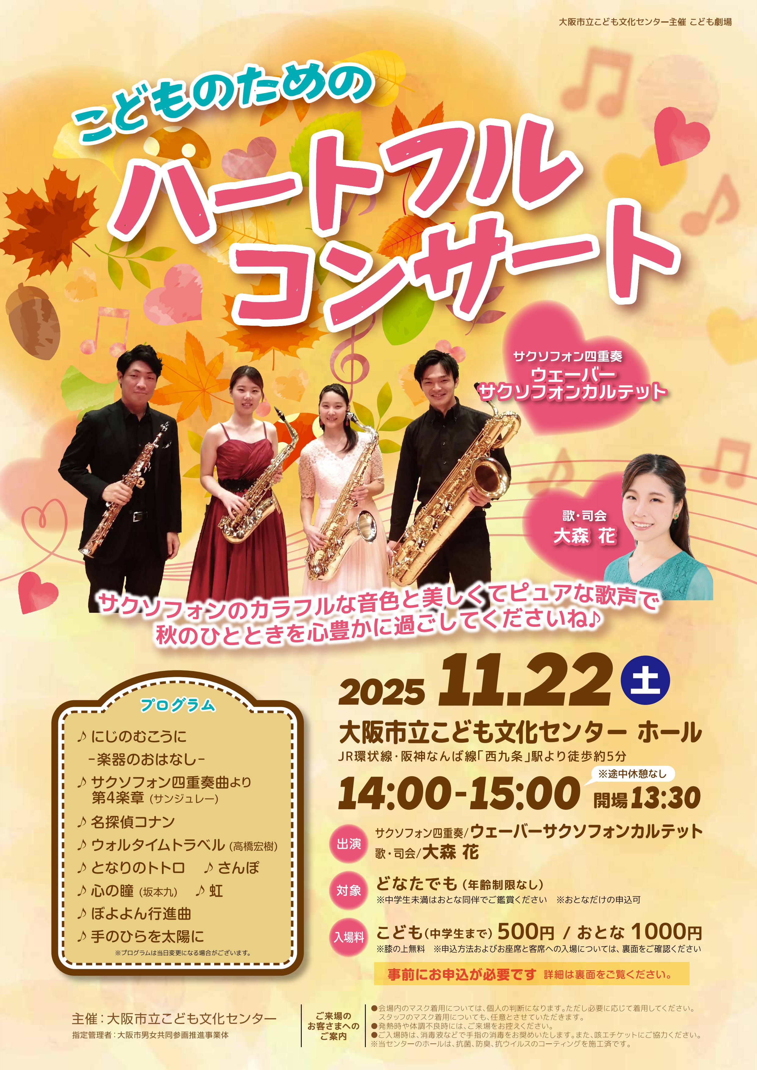 秋は音楽の季節♪ みなさんはサクソフォンを知っていますか?ベルギーのアドルフ・サックスさんが発明した楽器で、もともと吹奏楽団の木管楽器と金管楽器の橋渡しを目的に開発され、今ではクラシック音楽からポップス、ロック、ジャズなど、いろんなジャンルの音楽で使われているんだよ♪今回は、ウェーバーサクソフォンカルテットによるアンサンブルに、大森花さんの美しい歌声とお話が花を添えて、1時間の充実したプログラムをお届けします。どうぞお楽しみに♪ ☆曲目 ♪にじのむこうに ♪楽器のおはなし ♪サクソフォン四重奏曲より第4楽章(サンジュレー) ♪名探偵コナン ♪ウォルタイムトラベル(高橋宏樹) ♪となりのトトロ ♪さんぽ ♪心の瞳(坂本九) ♪虹 ♪ぼよよん行進曲 ♪手のひらを太陽に ------------------------------------------------------------------- ~お座席と客席へのご入場について~ ・お申込は先着順に受け付け、事前にセンターがお座席を指定いたします。 席番は当日お伝えします。事前通知はいたしません。 ・当日は、受付で「受付完了通知」をご提示いただくか、申込者名をお伝えください。代金と引換にチケットをお渡しします。 |