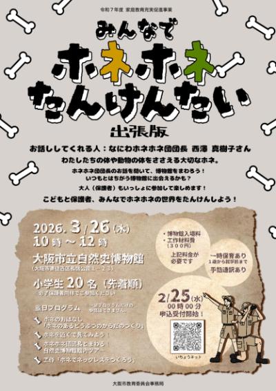 わたしたちの体や動物の体をささえる大切なホネ。 ホネホネ団団長のお話を聞いて、博物館をまわろう! いつもとはちがう博物館に出会えるかも? 大人(保護者)もいっしょに参加して楽しめます! こどもと保護者、みんなでホネホネの世界をたんけんしよう! 🦴ホネのおはなし「ホネのあるどうぶつのからだのつくり」 🦴ホネを近くで見てみよう! 🦴ホネホネ団団長とまわる!自然史博物館館内ツアー 🦴工作「ホネでネックレスをつくろう」 |