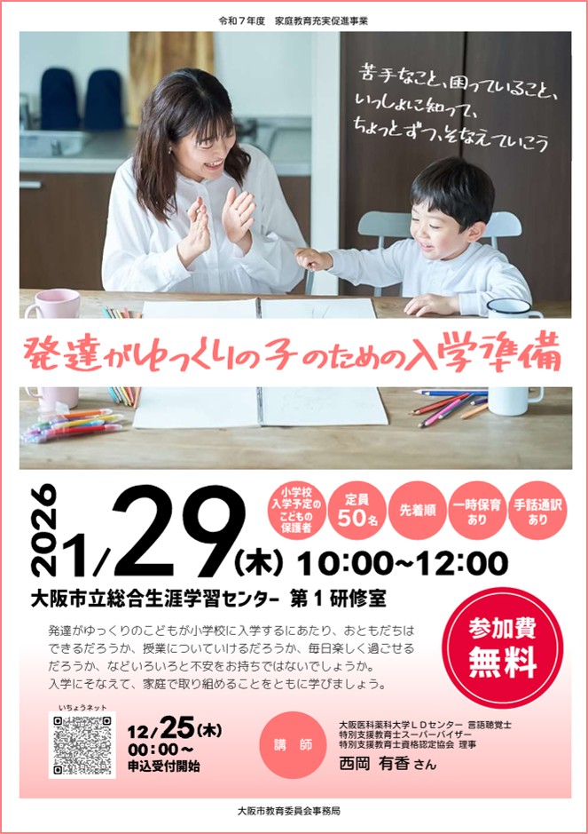 発達のゆっくりしたお子さんが1年生になるにあたり、家庭で取り組めることについて学びます。