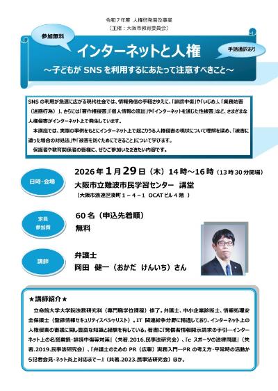 本講座では、実際の事例をもとにインターネット上で起こりうる人権侵害の現状について理解を深め、「被害に遭った場合の対処法」や「被害を防ぐためにできること」について学びます。