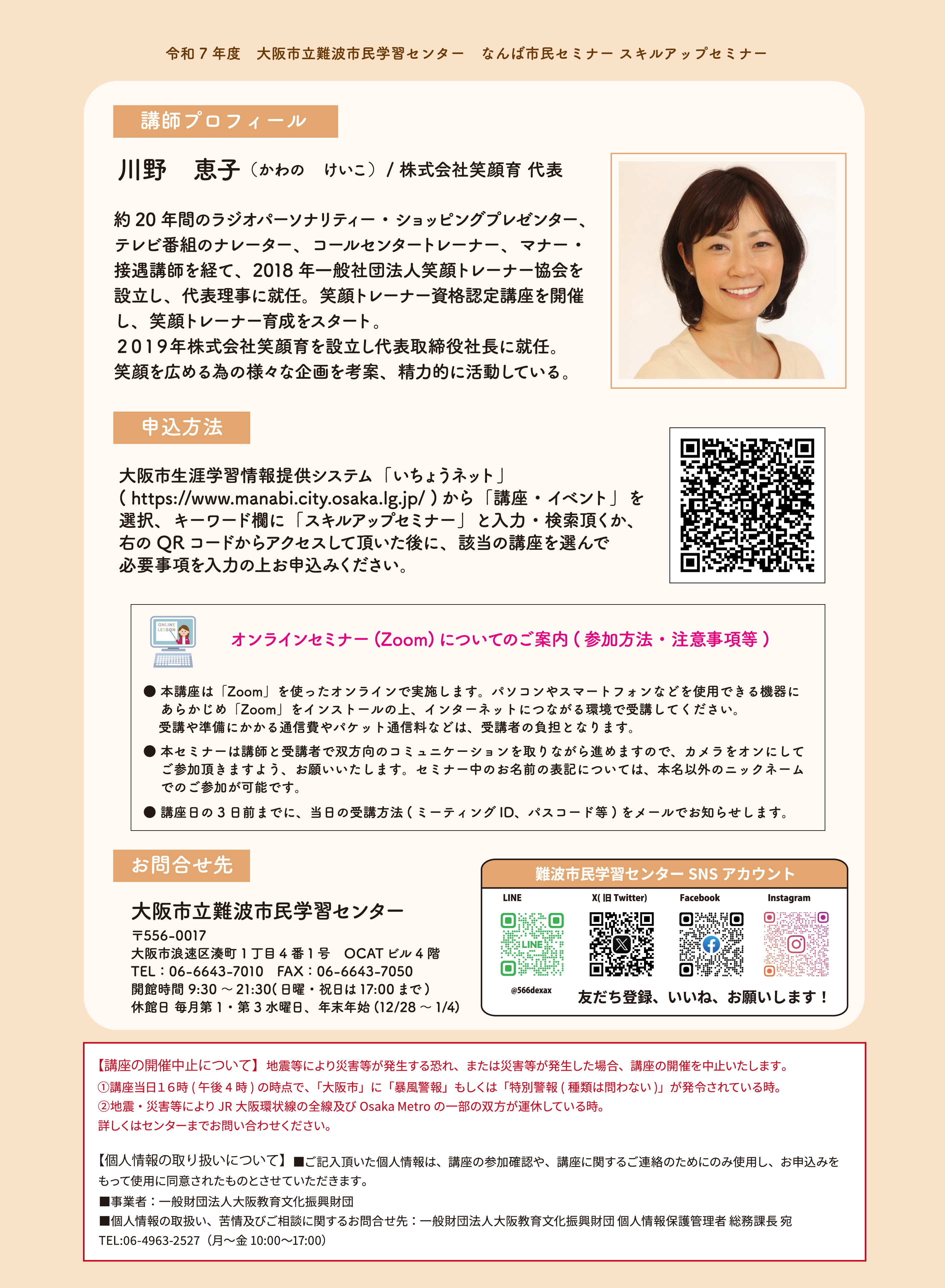 ※講座中、講師と受講者でコミュニケーションを取りながら進める場合がありますので、 カメラをオンにしてご参加ください。また講座中、講師からマイクをオンにするご協力をお願いする場合があります。