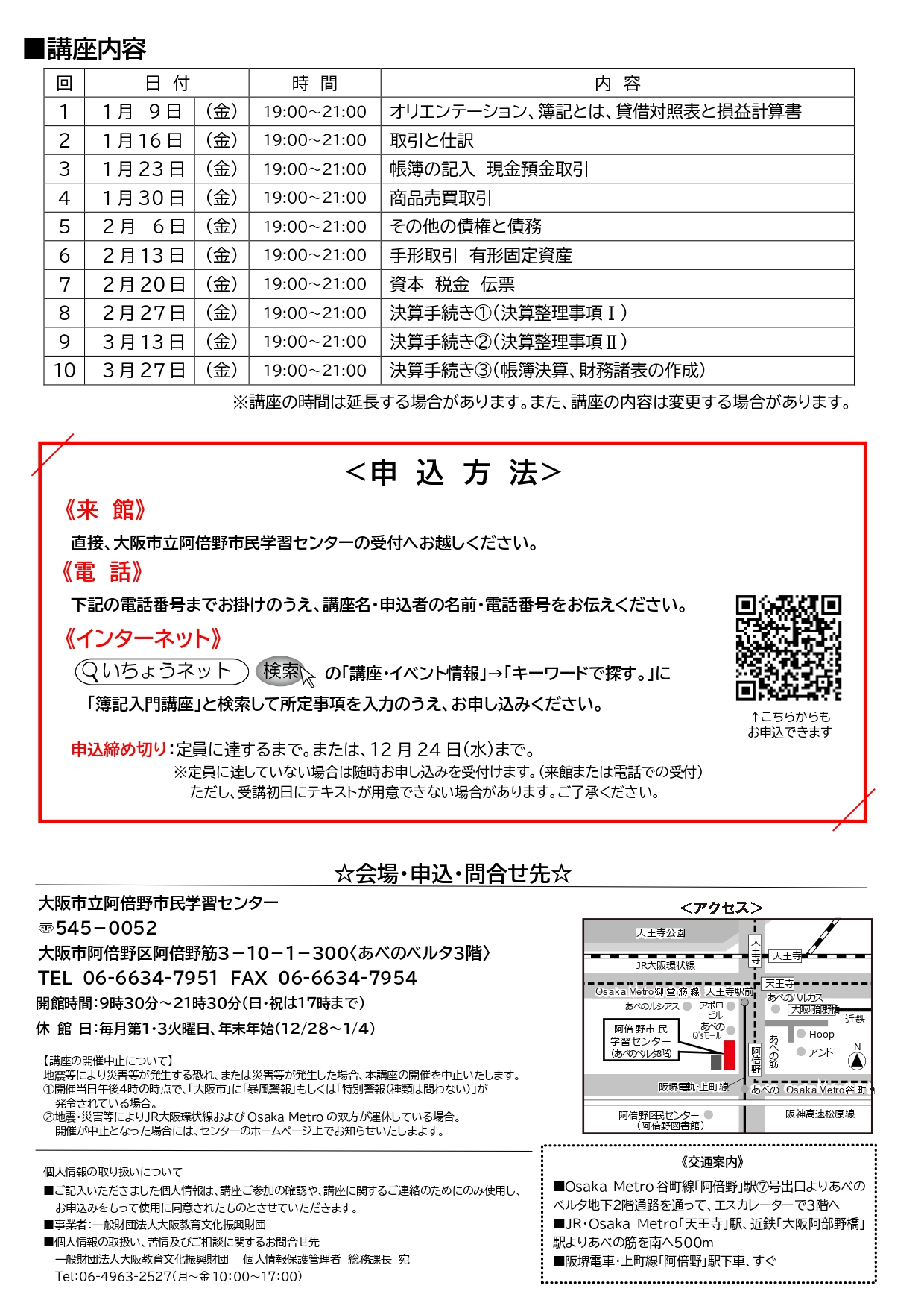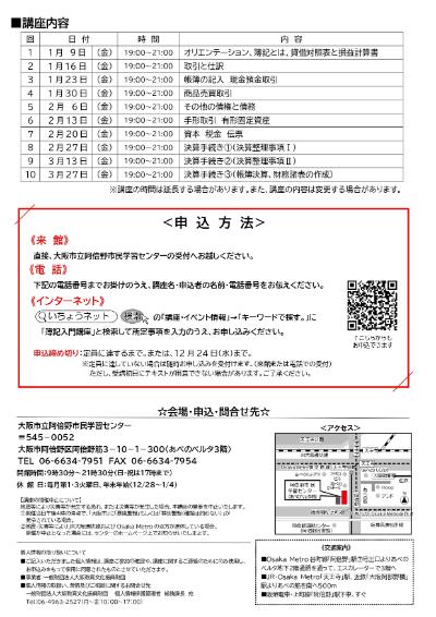 金曜日の夜に阿倍野で簿記を学びませんか?初めて簿記を学習する方向けの講座です。