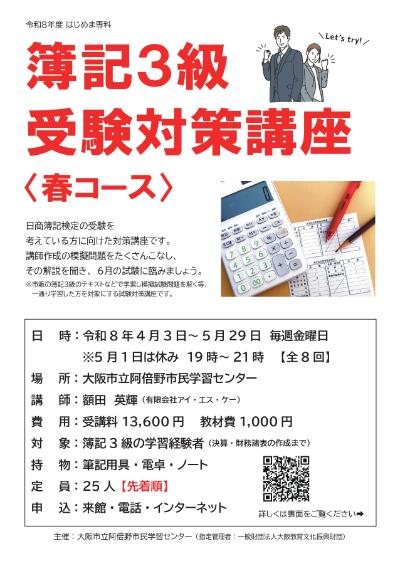 2026年6月に実施予定の日商簿記3級検定の受験を考えている方、再挑戦を考えている方、金曜の夜に阿倍野で学びませんか?
