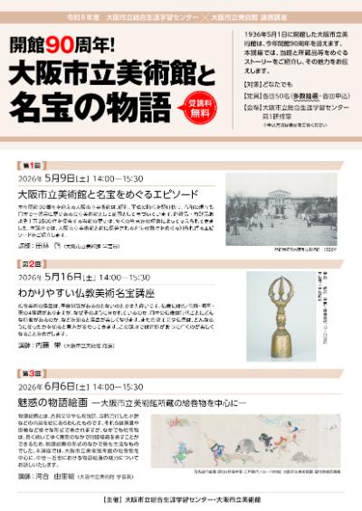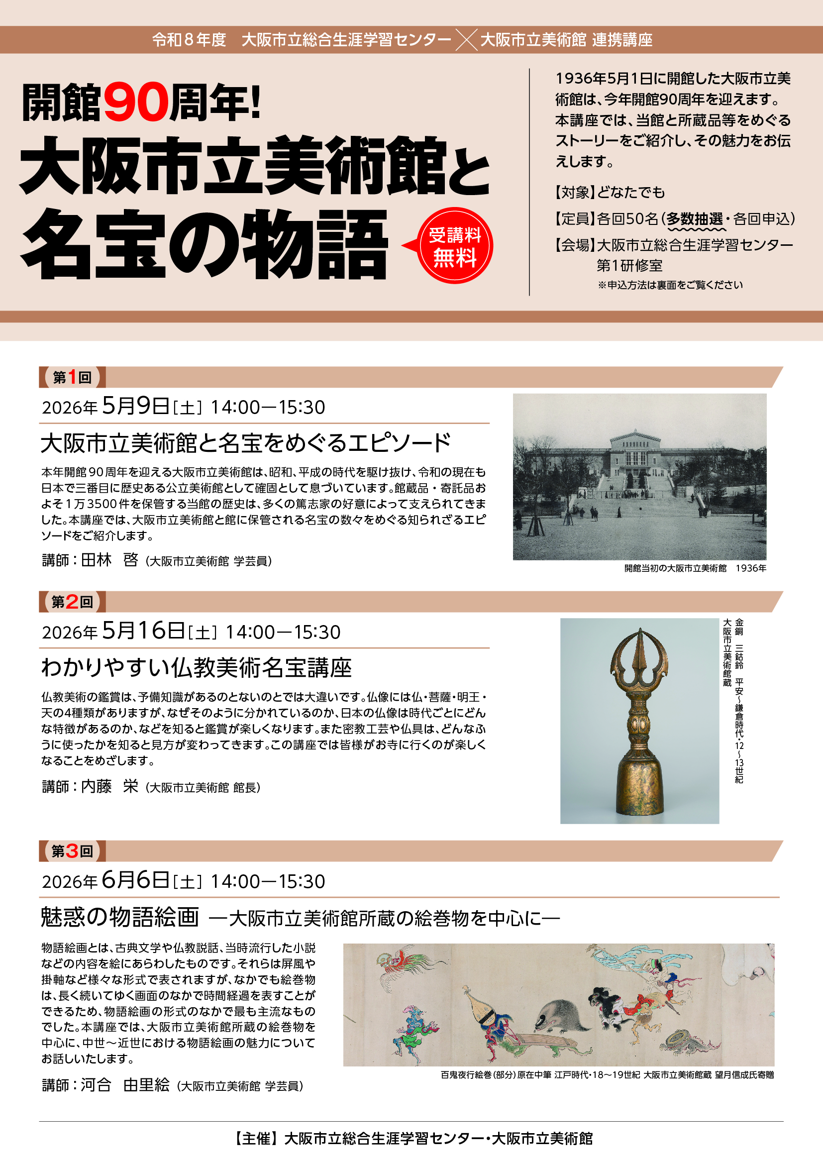 1936年5月1日に開館した大阪市立美術館は、今年開館90周年を迎えます。本講座では、当館と所蔵品等をめぐるストーリーをご紹介し、その魅力をお伝えします。