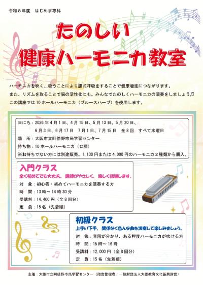 たのしい健康ハーモニカ教室【初級クラス】※インターネット受付は終了しました。来館または電話にて受付します。