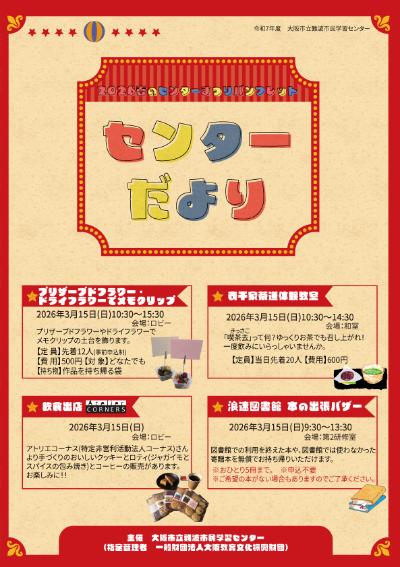 難波市民学習センターで活動するグループ・団体による①一日体験教室 ②ステージ発表 ③作品展示④PR動画配信