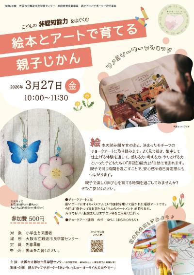 近年こどもの成長において「非認知能力」の重要性が注目されています。本講座では絵本とチョークアートを使ってその力をはぐくむ体験をします。親子で楽しく学び心を育てる時間を過ごしてみませんか?ぜひご参加ください。