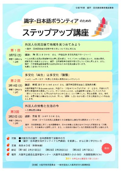 ●大阪市内の識字・日本語教室で活動中の方 ●「識字・日本語交流ボランティア入門講座」を受講し、さらに深く学びたい方