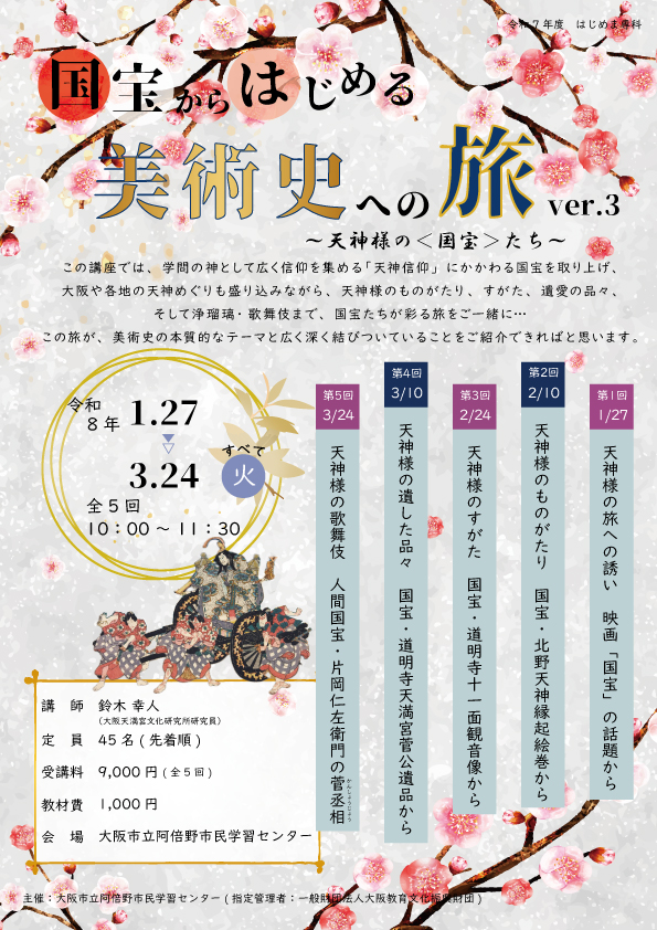 学問の神として広く信仰を集める「天神信仰」にかかわる国宝を取り上げ、大阪や各地の天神めぐり、天神様のものがたり、すがた、遺愛の品々などを紹介する。